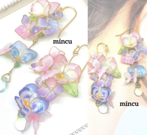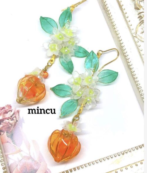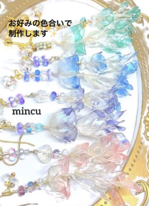 デップアートという独自の技法を用いて、繊細な花々を美しく表現しています。「ハンドメイドアクセサリー認定講師」の資格を持つmincuさんの技術は、まさに一級品。