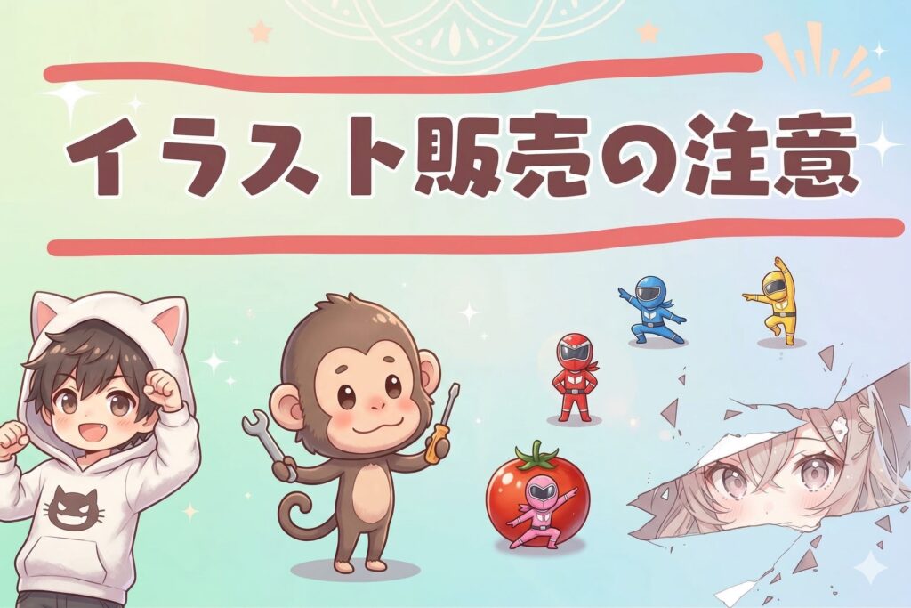 たとえ自分で描いたイラストであっても、権利者の許可なく販売すると著作権侵害にあたり、規約違反となります。